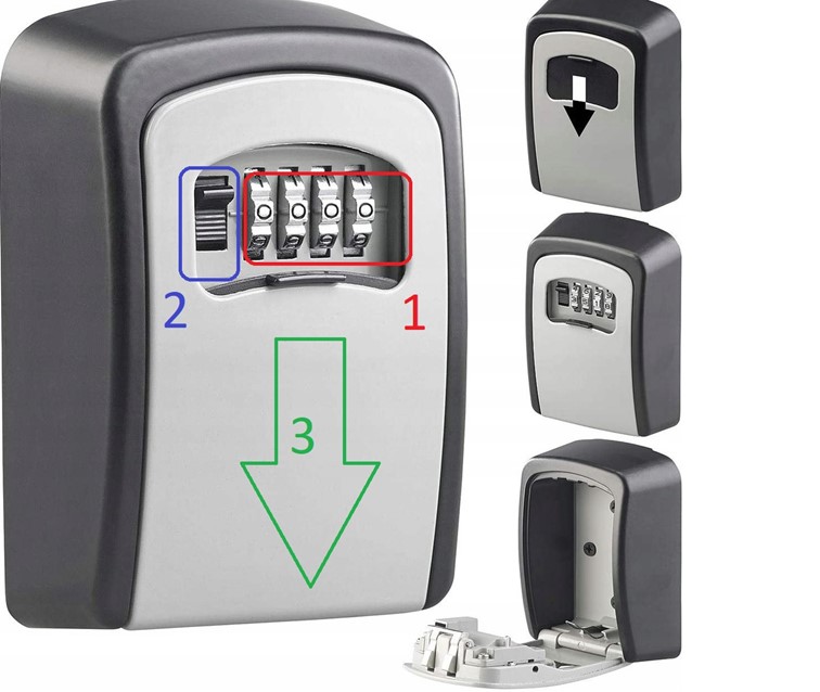 2. Pull the black lever marked #2, thus opening the lid of the safe marked #3 (If there is a problem with pulling the lever, push the gray part of the safe and try to pull the black lever again).